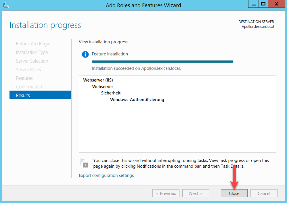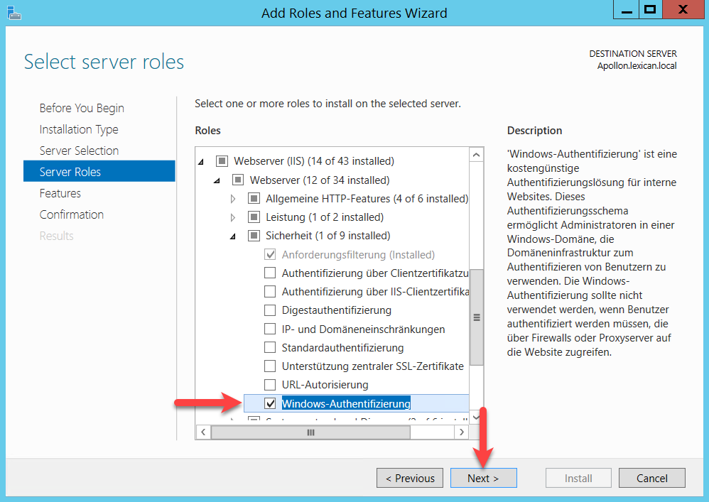 In the installation wizard, click on ‘Next’ to proceed to the ‘Server Roles’ section. There, under ‘Web Server (IIS)/Webserver/Security’, select the ‘Windows Authentication’ role and confirm with ‘Next’.