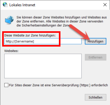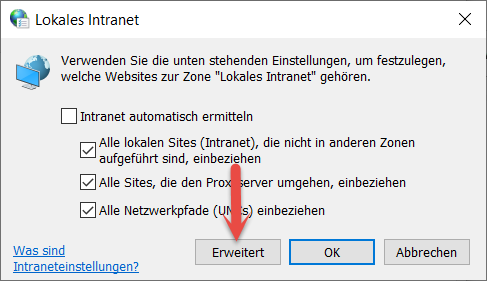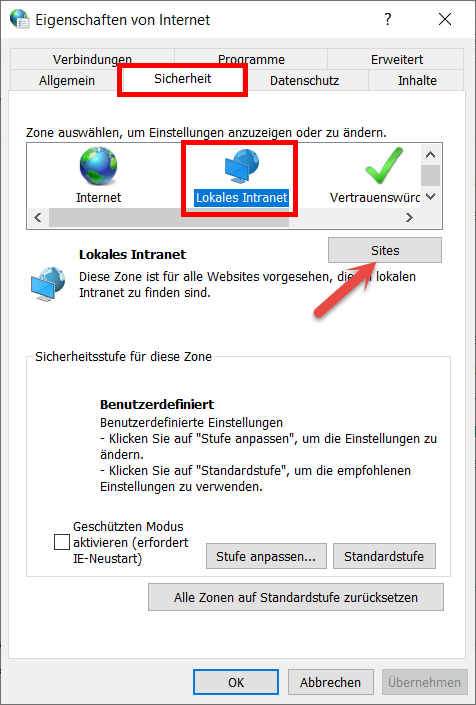 In the following dialogue window, select the tab ‘Security’ and then ‘Local Intranet’. Click on ‘Sites’.