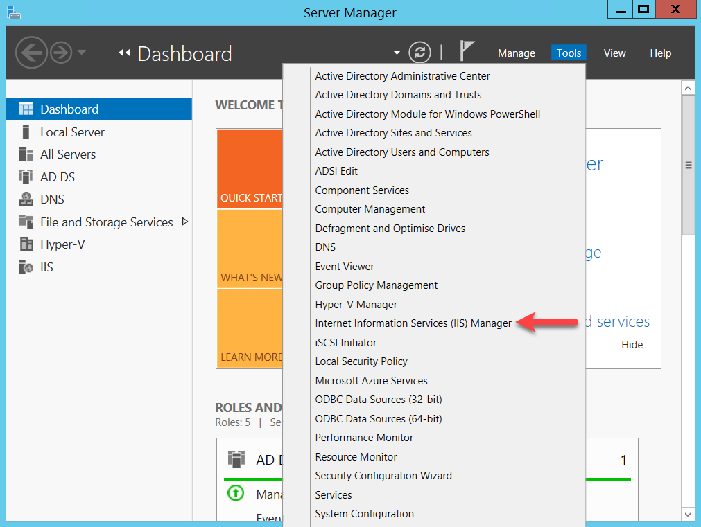Start the Server Manager and choose ‘Internet Information Services (IIS) Manager’ from the ‘Tools’ menu.