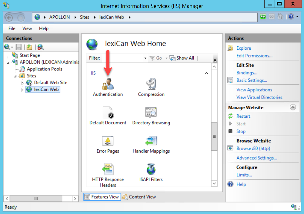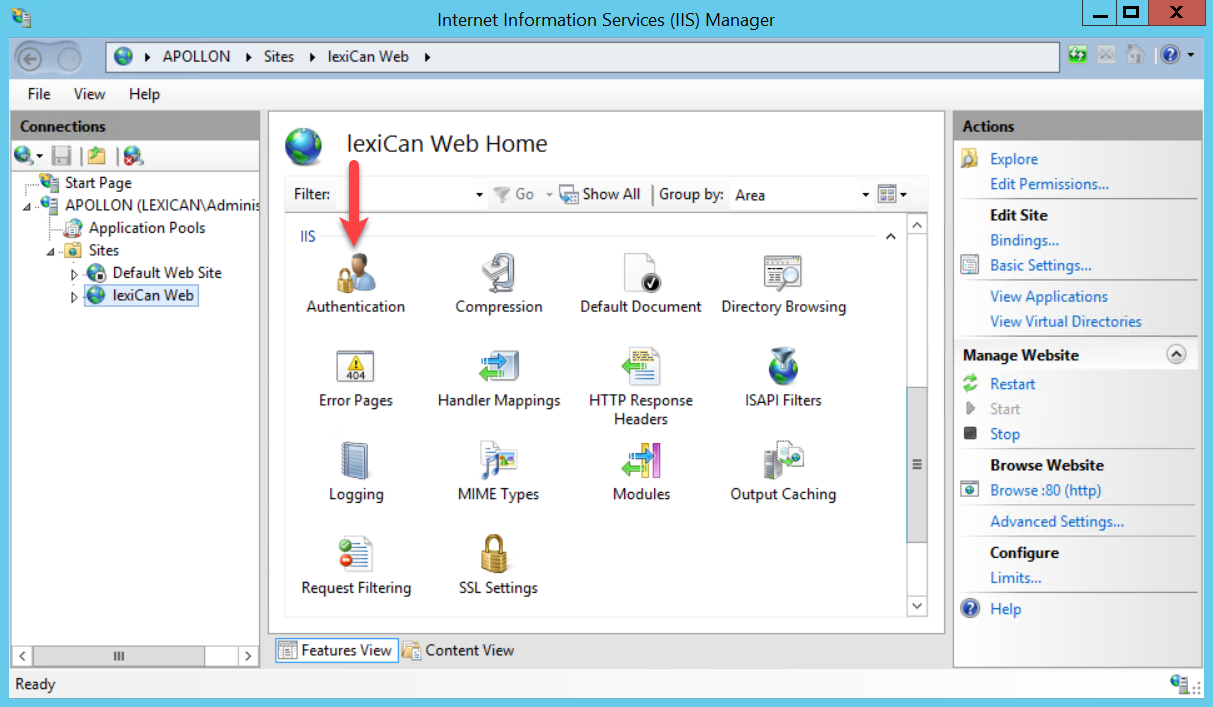 In the manager in the left area first select the node with the server name, then ‘Sites’ and finally ‘lexiCan Web’. Then double-click on ‘Authentication’ in the middle area of the window.