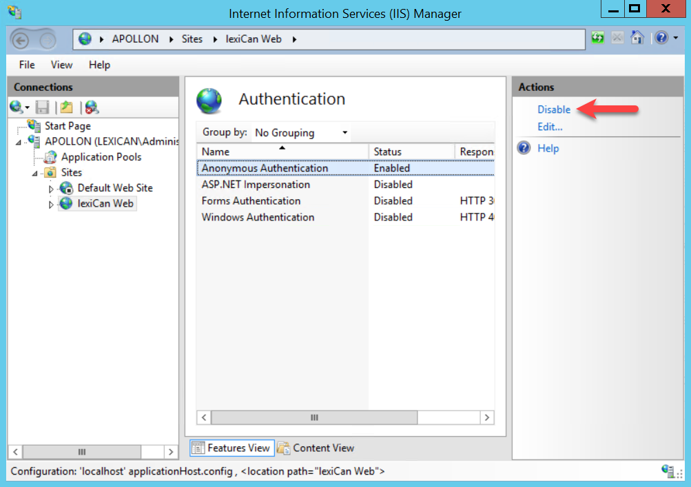 In the list of authentication methods, select ‘Anonymous Authentication’ and disable it.