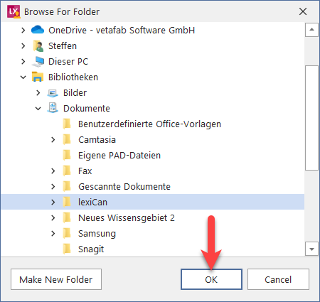 The dialog box will then show you all your local drives and external storage devices. Select the appropriate one and confirm with ‘OK’. If desired, you can also create a new file folder by clicking on ‘Make New Folder’, e.g.