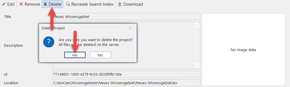 You can delete a project and all its data completely. This function is especially intended for users of the lexiCan Cloud who do not have access to data directories of the server. Start the Administrator, select the relevant project, click on ‘Delete’ and then confirm in the dialog box with ‘Yes’.