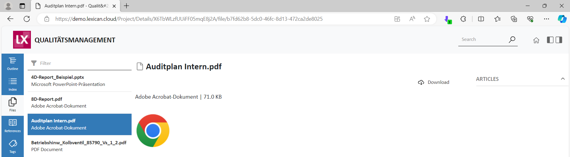 If you click on a file link, the file is normally downloaded directly. However, it is also possible to open only the detailed view of the file where a download option is available, e.g.