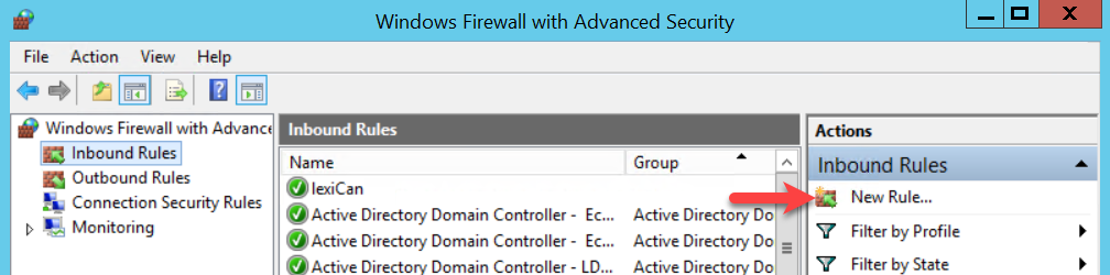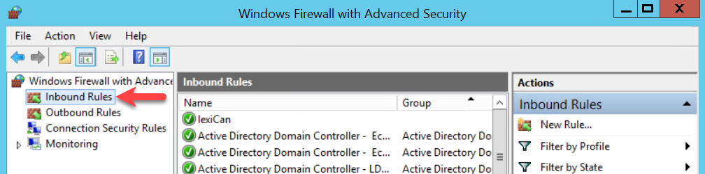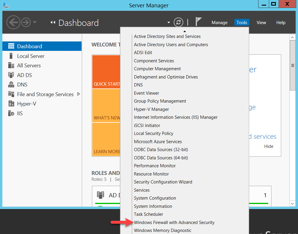 Start the ‘Server Manager’ and from the ‘Tools’ menu select ‘Windows Firewall with Advanced Security’ (Windows Server 2019 ‘Windows Defender Firewall with Advanced Security’).