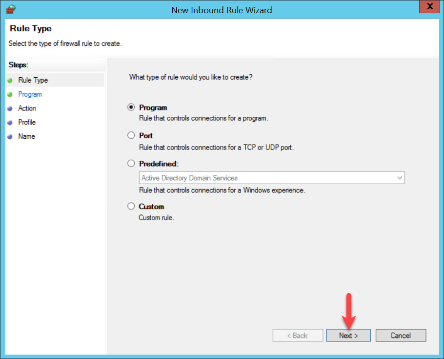 In the New Incoming Rules Wizard, select ‘Program’ and confirm with ‘Next’.