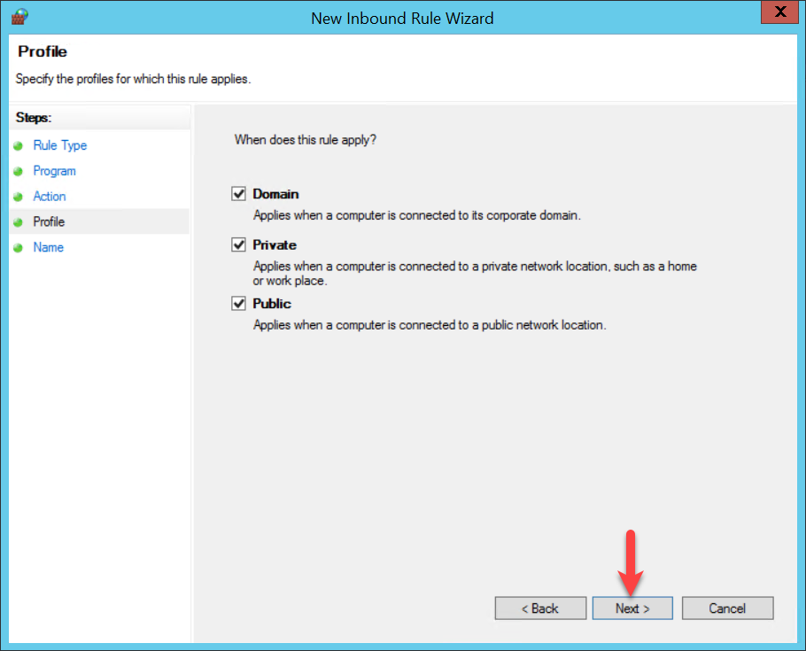 Now specify the network configuration for which the share should apply (Domain, Private, Public) and confirm via ‘Next’.