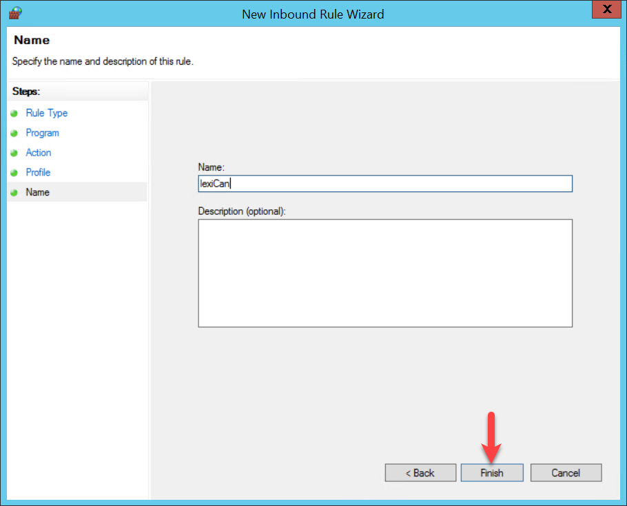 Now you have to define the name of the new rule, give a short description (recommended) and finish the process by clicking ‘Finish’.