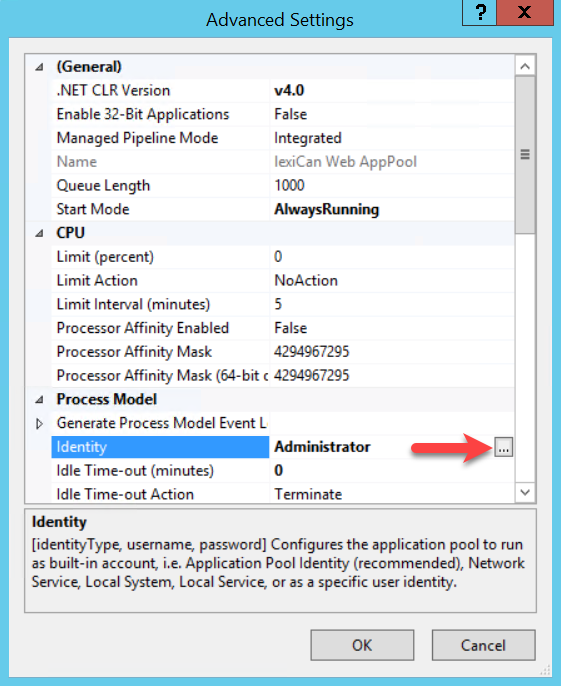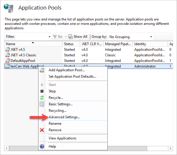 Using the right mouse button, select "Advanced settings" from the context menu of the "lexiCan Web AppPool".
