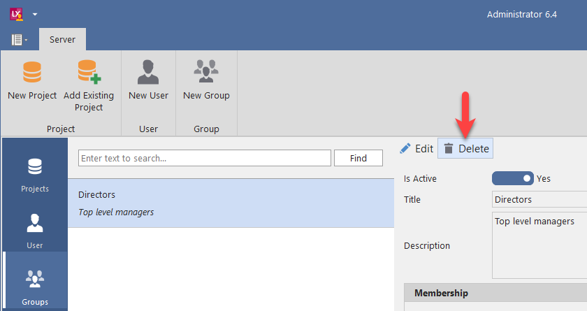 To delete a user group, start the administrator, select the relevant user group in the navigation on the left and click on ‘Delete’ in the toolbar, e.g.