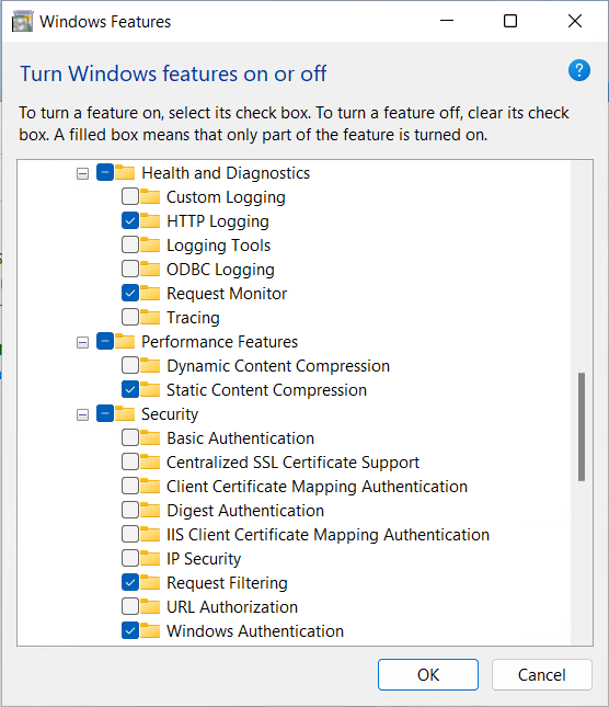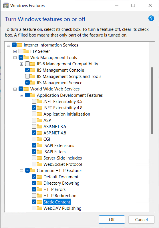 In the dialogue box, search for ‘Internet Information Services’ and activate several functions as shown in the following figure.