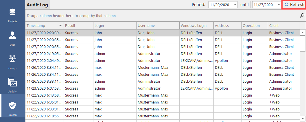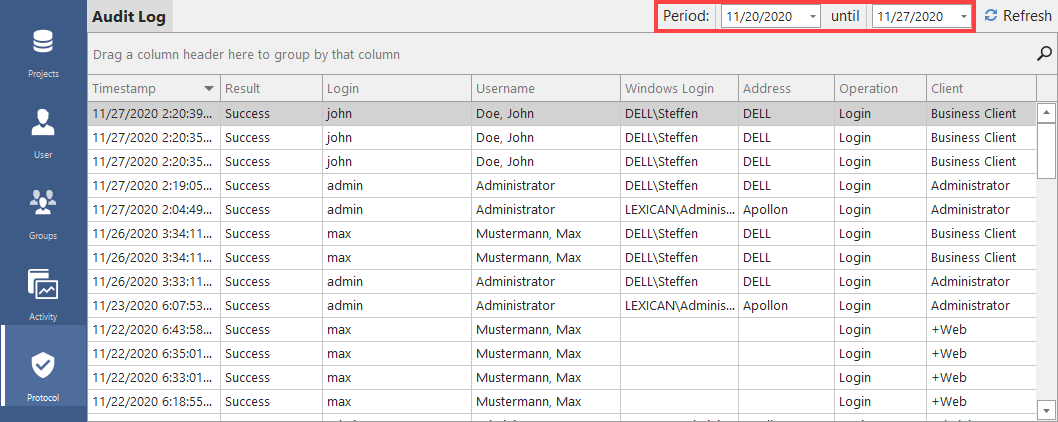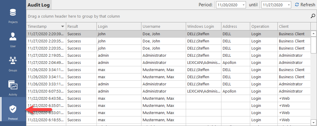 The security log provides information about which system logon was performed at a specific time. It shows the time, success/failure, ID, name and network ID of each user, and the name of the computer. The last column indicates whether the access was made through the client software or the web client +WEB.