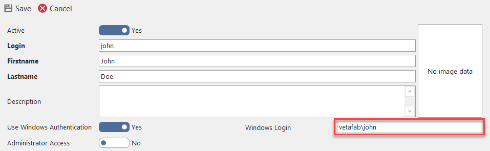 The use of Windows authentication enables the single sign-on function, i.e. a user is automatically logged on to the system via his network account and its connection to his user account in lexiCan and does not have to go through a logon process. This corresponds to the Single Sign-on function when using the Active Directory authentication. After activating the Windows authentication, you must enter the network domain followed by the user's individual network account in the following field, e.g.
