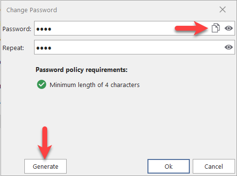 If you have not activated Windows authentication, you will be asked to define a password that meets the requirements. You can define this yourself or have the system generate it (‘Generate‘ button) and copy it to the clipboard.