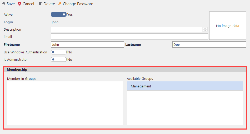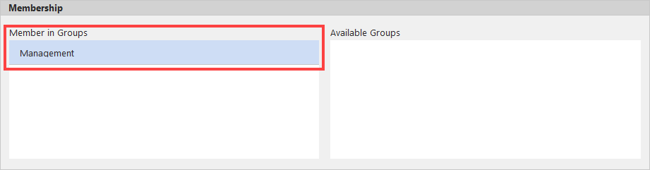By double-clicking on an available group, the user account is added to the group, e.g.