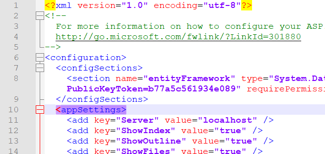 In the ‘<appSettings>’ section, you can (de)activate functions and display areas of +WEB.