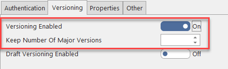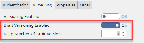 If versioning is activated, all or any number of previous versions of an article are archived, remain visible and can be restored, i.e. made into the current version, if desired. Select the ‘Versioning’ tab and make the right configuration for you. If you do not specify an exact number of versions, all previous versions will be saved permanently.