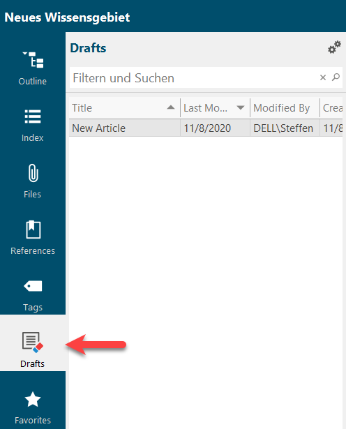 This function allows you to save articles as a draft first. In this status the article is not displayed in the index and outline of the project, but in a special area ‘Drafts’ of the navigation, e.g.