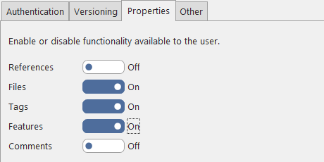 You can deactivate individual program functions in the "Properties" area if, for example, you do not want to manage sources with lexiCan or switch off the comment function e.g.